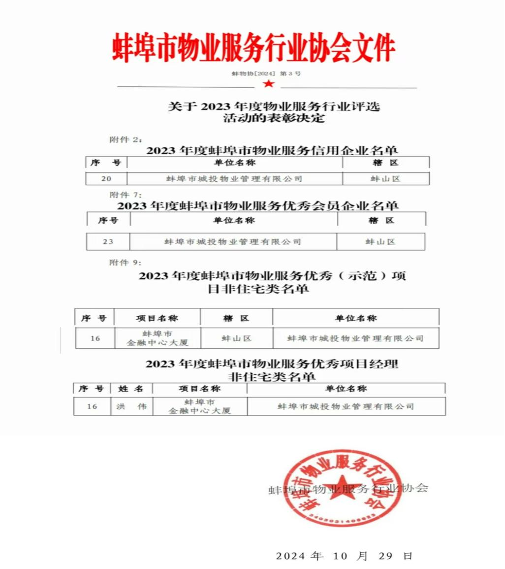 10月29日,城投物業(yè)公司在 2023 年度物業(yè)服務(wù)行業(yè)評(píng)選表彰活動(dòng)中喜獲2023年度蚌埠市物業(yè)服務(wù)信用企業(yè)、2023年度蚌埠市物業(yè)服務(wù)優(yōu)秀會(huì)員企業(yè)、2023年度蚌埠市物業(yè)服務(wù)優(yōu)秀(示范)項(xiàng)目非住宅類、2023年度蚌埠市物業(yè)服務(wù)優(yōu)秀項(xiàng)目經(jīng)理非住宅類等四項(xiàng)榮譽(yù)稱號(hào)。